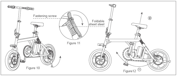 1. Adjust the heights of the bike head and saddle to the lowest and fold the kick-stand (see figure 10). Open the folding steel sheet to separate the folding steel sheet and fastening screw (see Figure 11). Pull the saddle up (see figure 12- ⑩ arrow) and rotate forward the rear wheel to fold (see figure 12- 11 arrow).