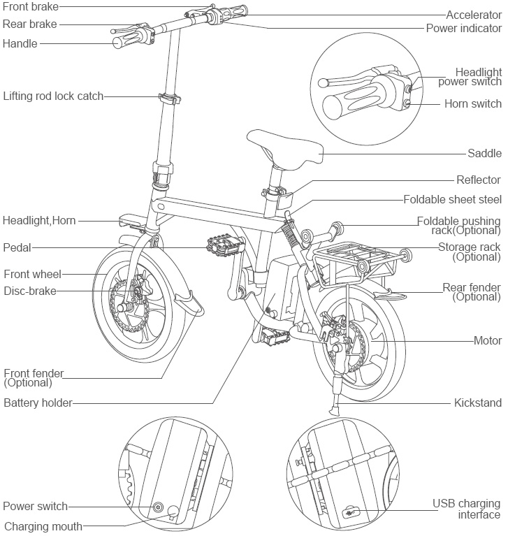 Set right the head, fold kickstand and fasten frame. Adjust bike head and saddle position to ensure a comfortable riding experience. Find the power switch in the one side of the battery, start it and hold the handle. First sit on the saddle and step on the pedals one foot by one foot. When riders are ready to ride it, they can push the accelerator in the right handle to accelerate.